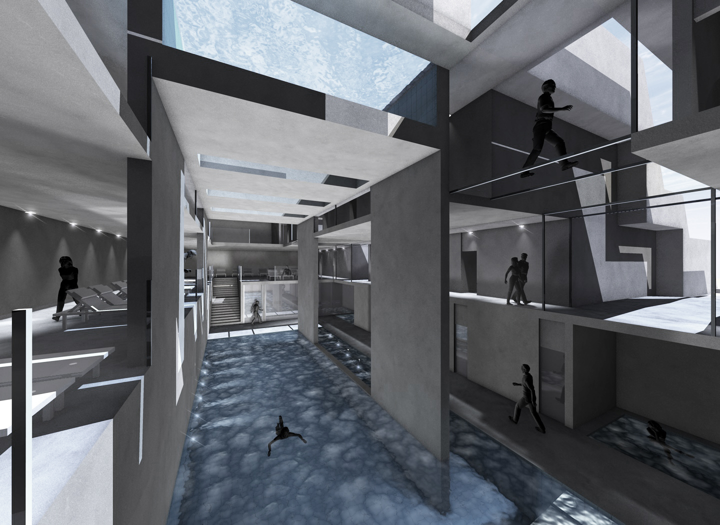 I wanted to preserve and put even more emphahis on the old Mansion therefore I designed the surrounding program under ground behind the original building. Inside the Mansion are Offices, Meeting rooms and the Restaurant. In the new extension I put Hotel with Spa, Wellness, Fitness program and Aesthetic Surgery.